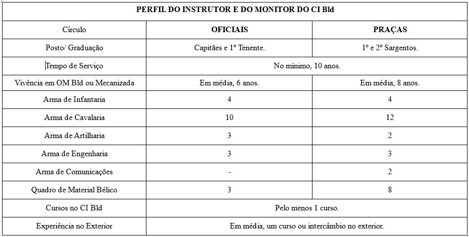 O quadro de cargos prevê que os 58 instrutores e monitores sejam, em sua maioria, 1º Tenentes e Capitães e 2º e 1º Sargentos. Esta configuração permite que o Centro receba militares com boa vivência profissional, que conhecem as demandas da OM; militares com experiência e conhecimento técnico, o que permite o aperfeiçoamento dos conhecimentos compartilhados; oficiais e sargentos possuidores de cursos ou estágios ministrados pelo CI Bld, o que garante a continuidade do aprendizado e profissionais maduros, garantindo um ensino que preza pela transmissão de conhecimentos com o máximo de segurança.